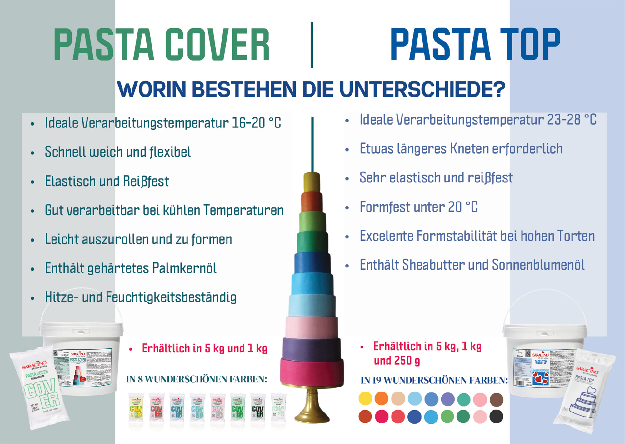 Die spezielle Rezeptur mit Shea-Butter und hoch oleischem Sonnenblumenöl sorgt für eine geschmeidige Verarbeitung und ein seidenmattes Finish – ganz ohne Palmöl oder gehärtete Fette. Pasta Top ist in 18 Farben erhältlich, lässt sich aber auch mühelos mit fettlöslichen Pulver- oder Gel-Lebensmittelfarben individuell einfärben. Ihr zartes Vanillearoma unterstreicht den süßen Geschmack des Kuchens und harmoniert perfekt mit verschiedenen Füllungen.